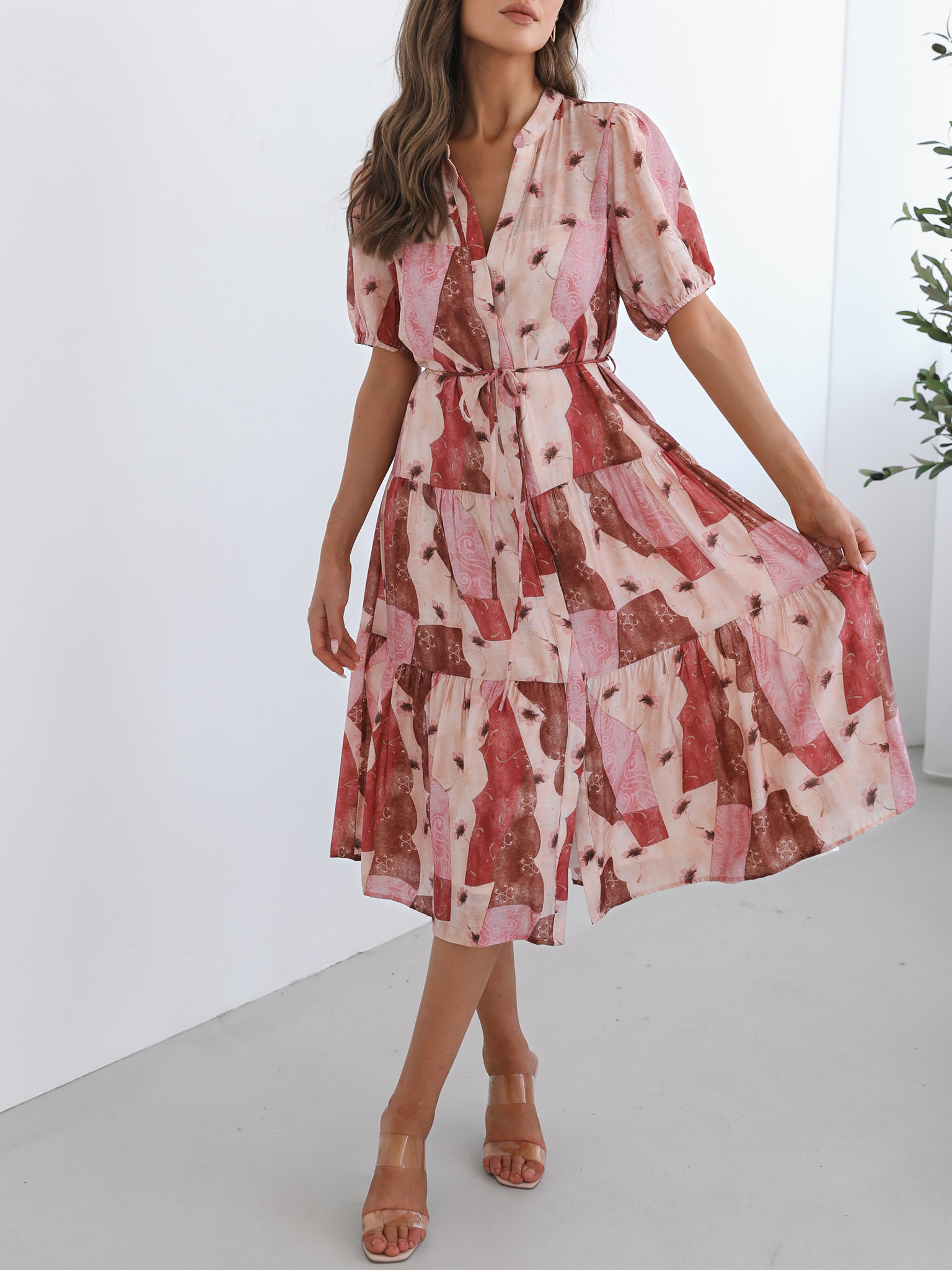 Multi Print Short Puff Sleeves Dress 358189